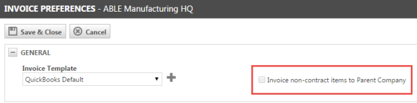 - Open the invoice settings for each sub-organization and make sure Invoice non-contract items to Parent Organization is cleared.