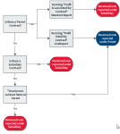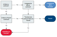The following flowchart shows which organization is invoiced for labor performed for a sub-organization organization, depending on contract and invoice settings.