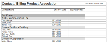 Description Contacts with a rule based billing product association, grouped by billing product, then by organization. Includes the effective and expiration date of the association.
