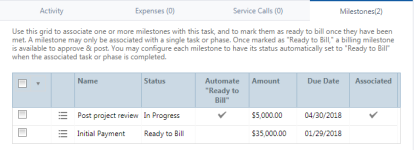 NOTE  If you select Automate "Ready to Bill", the milestone will be automatically set to Ready to Bill when its associated task or phase is set to Complete.
