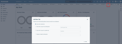 Drag and drop rows to determine the order in which tab groups are displayed. The active tab group with the lowest order number will be displayed when you log in. NOTE When a shared dashboard tab gets published to you, Autotask will attempt to put it at the end of your first (leftmost) tab group. If that tab group is already full (no more tabs can be added), that tab will not be added to the first tab group, but it will be available to be added to any tab group if you later add a new tab and choose the Display (re-open) existing tab option. |