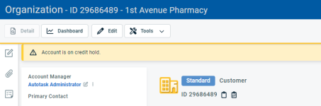 On the Organization Alerts tab, you configure messages that will appear as alerts on several Autotask pages for the specific customer only.