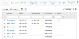 The Contacts tab appears on the accessory tabs of the Organization page. It displays all contacts associated with the organization. To open the page, use the path(s) in the Security and navigation section above.