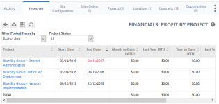 The Profit by Project table shows you current and historical profit information for the organization's projects, and allows you to compare month-to-date and year-to-date figures to the same time period last year. To open the page, use the path(s) in the Security and navigation section above.