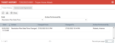 - The change to the SLA event date is tracked on the Ticket History tab.
