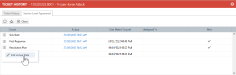 For each SLA event, all resources with access to the ticket can view the actual date and time the event was recorded, the target date and time (i.e., the due date), who the ticket was assigned to when the event was recorded, and an indicator of whether the event time frame was met.