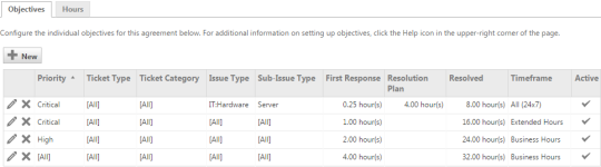 - The timeframe (Business Hours, Extended Hours or All (24x7)) for when the SLA clock is running