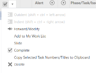 Complete | Sets the item status to complete. Completed items no longer appear in the My Tasks and Tickets list of assigned resources. They do not appear in the list of tasks when you select View My Tasks for Projects from the right-click menu on the My Projects page. |
