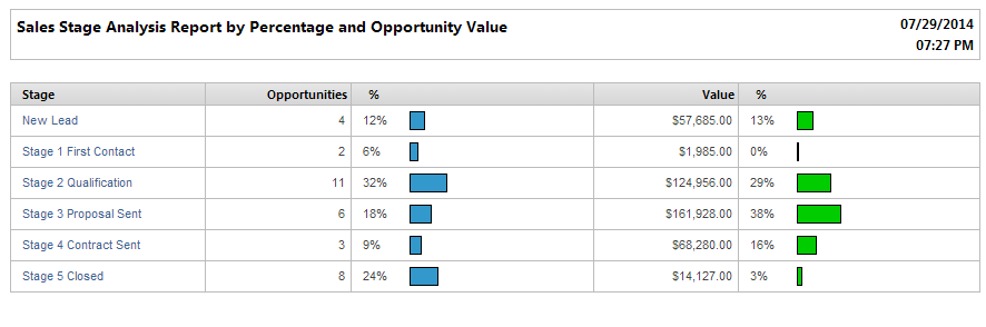 Description Opportunity amounts and percentage of opportunities at different stages in the sales process.