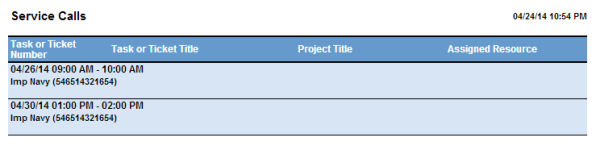 Description | This report shows service calls that have a Start Date within the filter criteria. The report is grouped by service call. For each service call, it shows all the tasks/tickets associated with the service calls as well as the assigned resources. |