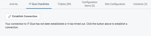 The IT Glue Checklists tab appears on the accessory tabs of the Organization page. On this tab, you can establish the connection between your Autotask and IT Glue user accounts.