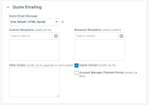 NOTE   You can also set the CC: and BCC: fields in the Quote Email Message, which is configured by your Autotask Administrator. Autotask combines recipient settings from both fields and then removes duplicates. Refer to Adding or editing email message templates for invoices or quotes.