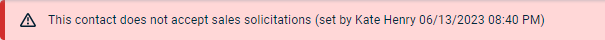 If the contact (or the contact associated with the opportunity or to-do you are viewing or editing) has opted out from receiving sales solicitations, you will see a pink banner displayed at the top of the page. On an opportunity, this banner appears if the associated contact has opted out of sales solicitations, even if the contact field is hidden by the opportunity's category.